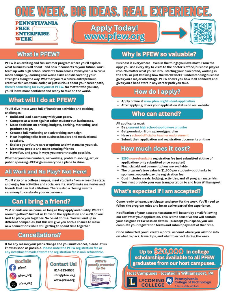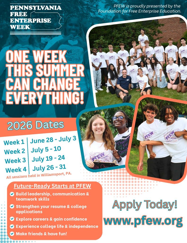PA Free Enterprise Week (PFEW) is an exciting and fun summer program for current Grade 10 & 11 students where you’ll explore what business is all about—and how it connects to your future. You’ll team up with high school students from across Pennsylvania to run a mock company, learning real-world skills and discovering your strengths along the way. Whether you’re a future entrepreneur, creative thinker, team leader, or just curious about your career path, there’s something for everyone at PFEW. No matter who you are, you’ll leave more confident and ready to take on the world. Check out the PFEW 2026 Poster for more information and to apply!